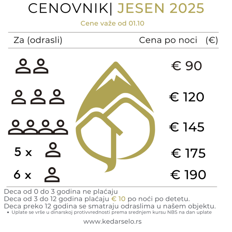 POLITIKA AVANSA: Za ostvarivanje rezervacije neophodna je uplata avansa od 50% ukupnog iznosa. Ukoliko je otkazivanje rezervacije do 12 dana pred dolazak, avans možemo vratiti. Ukoliko je otkaz u 12 dana pred dolazak, avans zadržavamo ali uvažavamo za sledeći izabrani dostupni termin do kraja tekuće godine. Moguće je samo jednom pomeriti rezervaciju a da se avans uvaži.